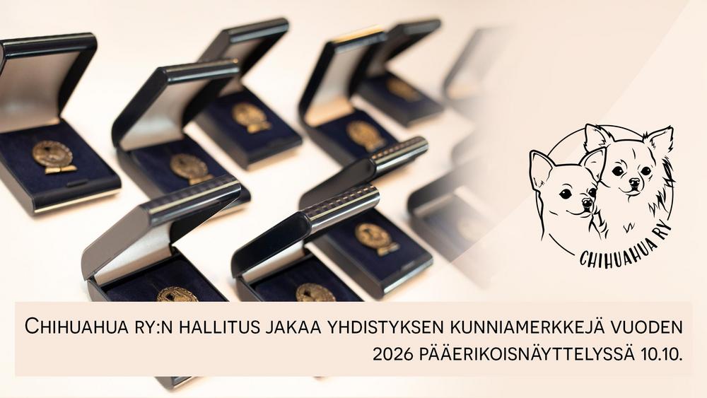 Chihuahua ry:n hallitus tulee jakamaan yhdistyksen kunniamerkkejä 10.10. vuoden 2026 erikoisnäyttelyssä, joka on samalla ICC:n eli kansainvälisen chihuahuayhdistyksen erikoisnäyttely. Kunniamerkki…