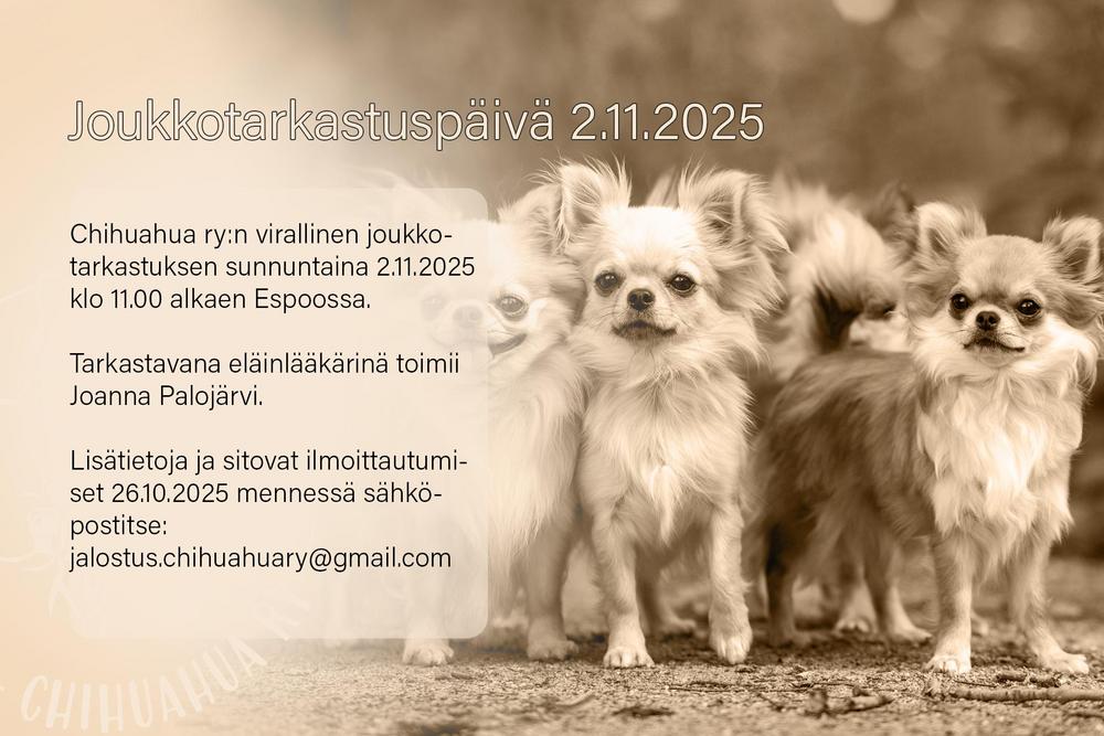 🐾 Chihuahua ry järjestää virallisen joukkotarkastuksen sunnuntaina 2.11.2025 klo 11.00 alkaen Espoossa. Tarkastavana eläinlääkärinä toimii Joanna Palojärvi. 🐾 Tarkastuksen hinnat Chihuahua ry:n…