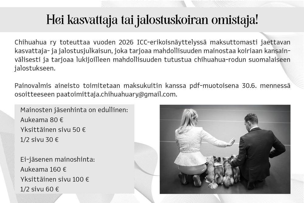 Chihuahua ry toteuttaa vuoden 2026 ICC-erikoisnäyttelyssä maksuttomasti jaettavan kasvattaja- ja jalostusjulkaisun, joka tarjoaa mahdollisuuden mainostaa koiriaan kansainvälisesti ja tarjoaa…