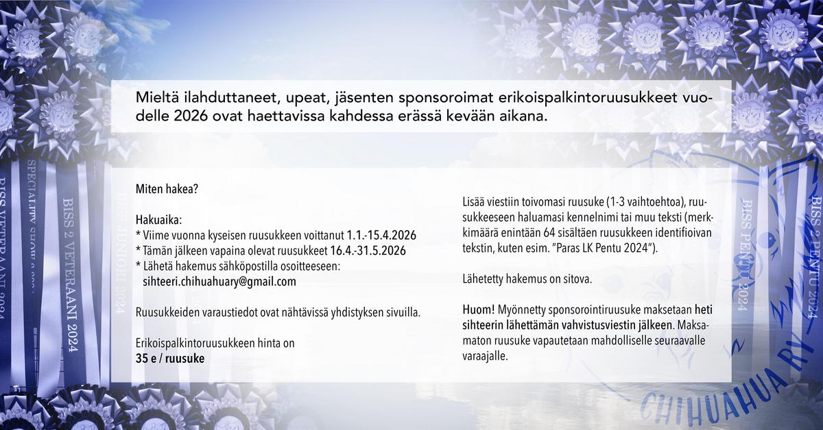 Mieltä ilahduttaneet, upeat, jäsenten sponsoroimat erikoispalkintoruusukkeet vuodelle 2026 ovat jälleen haettavissa. Ruusukkeeseen painetaan lahjoittajan nimi tai haluttu teksti.