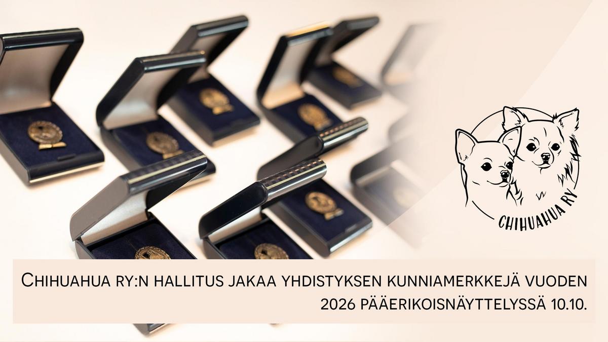 Chihuahua ry:n hallitus tulee jakamaan yhdistyksen kunniamerkkejä 10.10. vuoden 2026 erikoisnäyttelyssä, joka on samalla ICC:n eli kansainvälisen chihuahuayhdistyksen erikoisnäyttely.